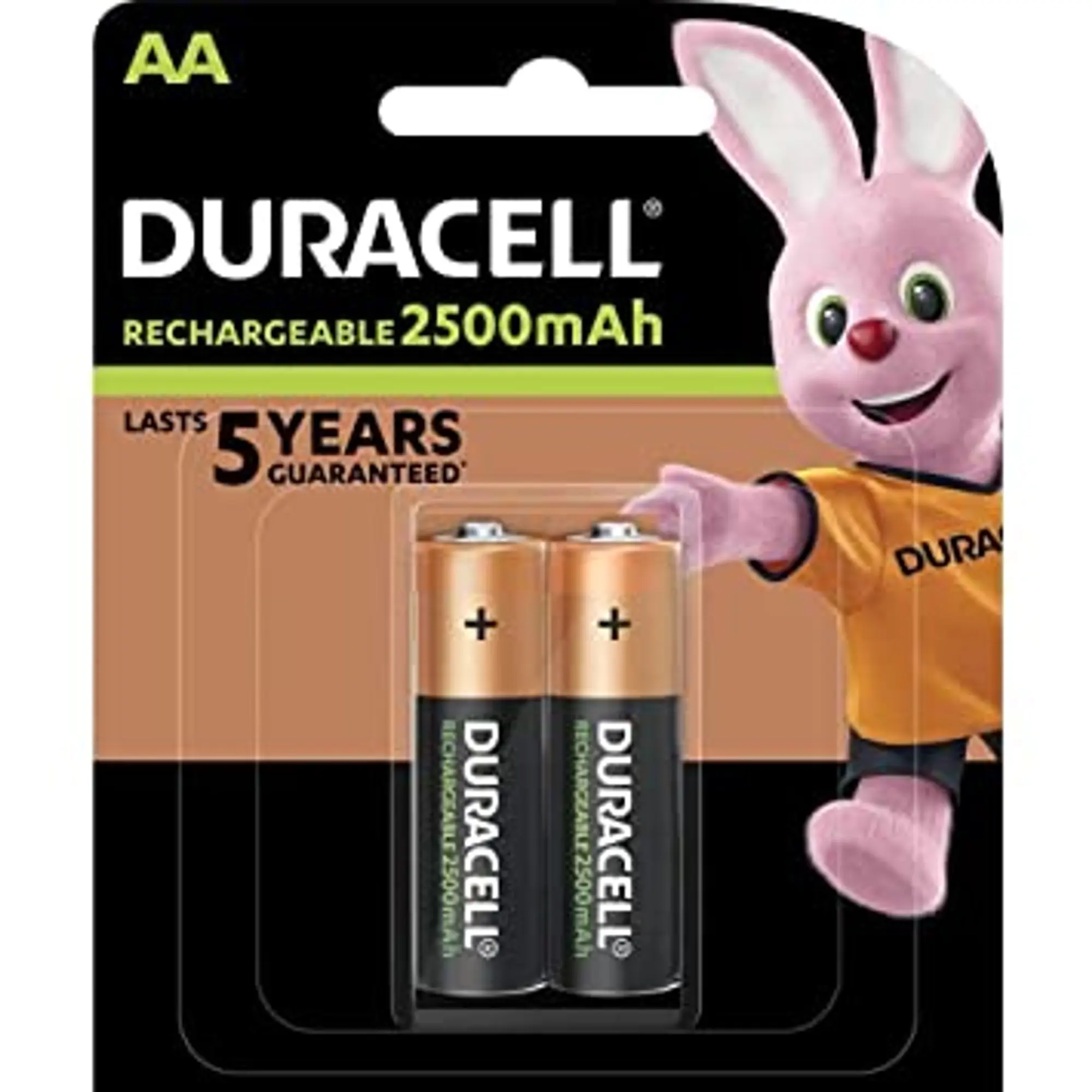 Duracell Rechargeable AA/2 (2500mAh) batteries are engineered for users who demand reliable, eco-friendly energy solutions. These high-capacity NiMH batteries are ideal for devices requiring sustained power, such as game controllers, flashlights, portable radios, and digital cameras. Featuring Duralock technology, they retain charge even when not in use and are pre-charged for instant usability. Designed for repeated use with minimal memory effect, they support hundreds of recharge cycles, reducing battery waste and saving money over time. Duracell's commitment to quality ensures consistent performance, with strong durability and compatibility across a wide range of AA-compatible devices.