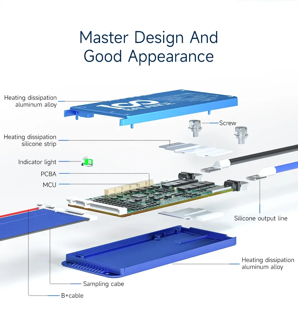 Advanced smart BMS supporting 4S to 8S lithium battery packs, featuring 40A current rating, Bluetooth connectivity, and active cell balancing. Ensures real-time monitoring, enhanced battery lifespan, and reliable protection for e-bikes, solar systems, and energy storage applications.