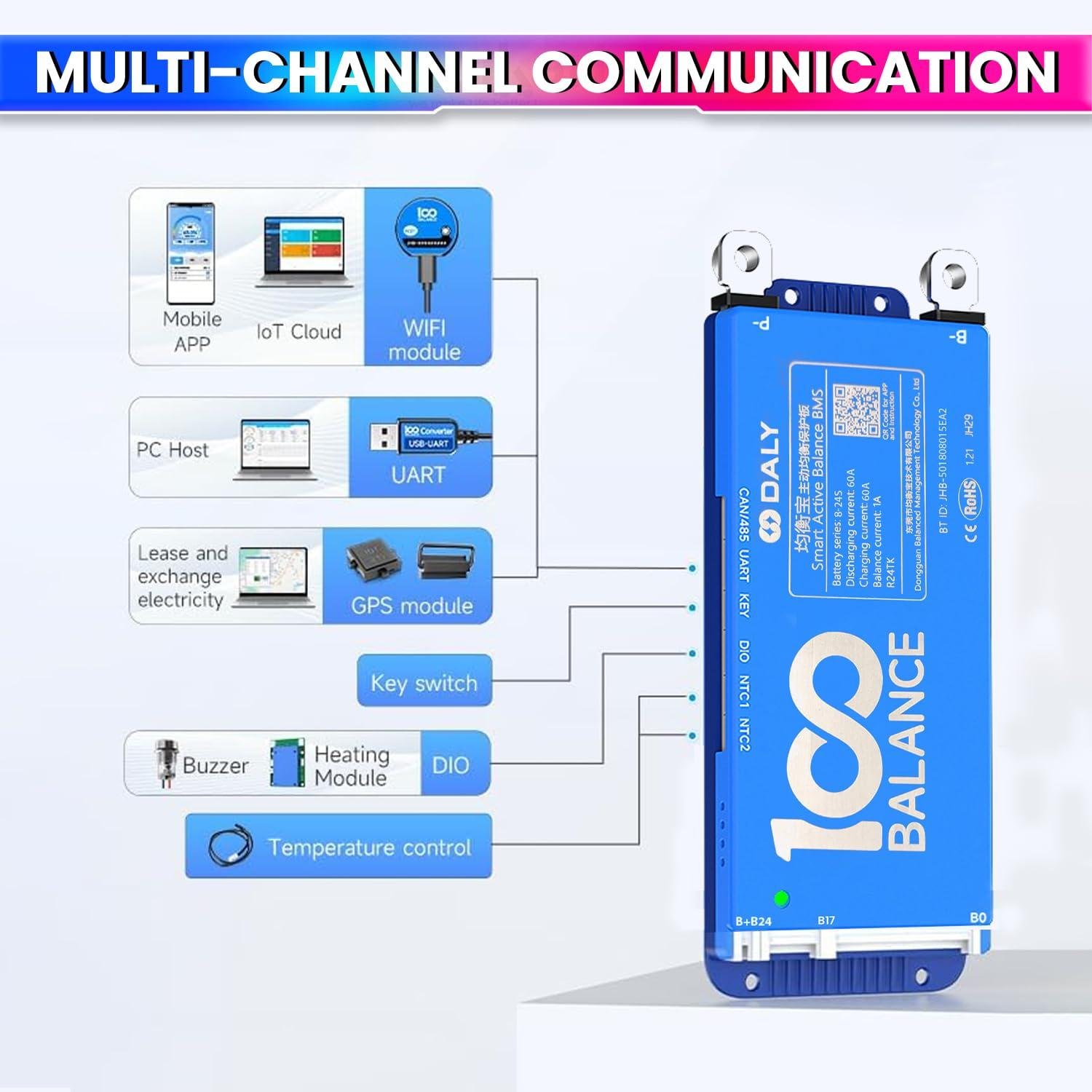 The DALY100 Balance 8S–24S 60A Smart BMS is a powerful and intelligent Battery Management System designed for lithium battery packs with 8 to 24 series cells. It supports 60A continuous discharge current, making it suitable for applications like electric vehicles, solar energy storage, and industrial battery systems. With built-in 1A active balancing, it ensures optimal voltage consistency across cells, improving performance and extending battery lifespan. The integrated Bluetooth module allows users to monitor and configure the BMS in real time through the 100BALANCE mobile app, ensuring safety and ease of use.